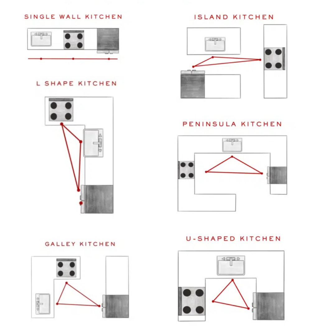 the kitchen work triangle is a long-established design concept used to create efficient and comfortable kitchen layouts. It’s based on connecting the three main work areas in a kitchen: The cooktop or range (where you cook), the sink (where you clean and prep), the refrigerator (where you store food).