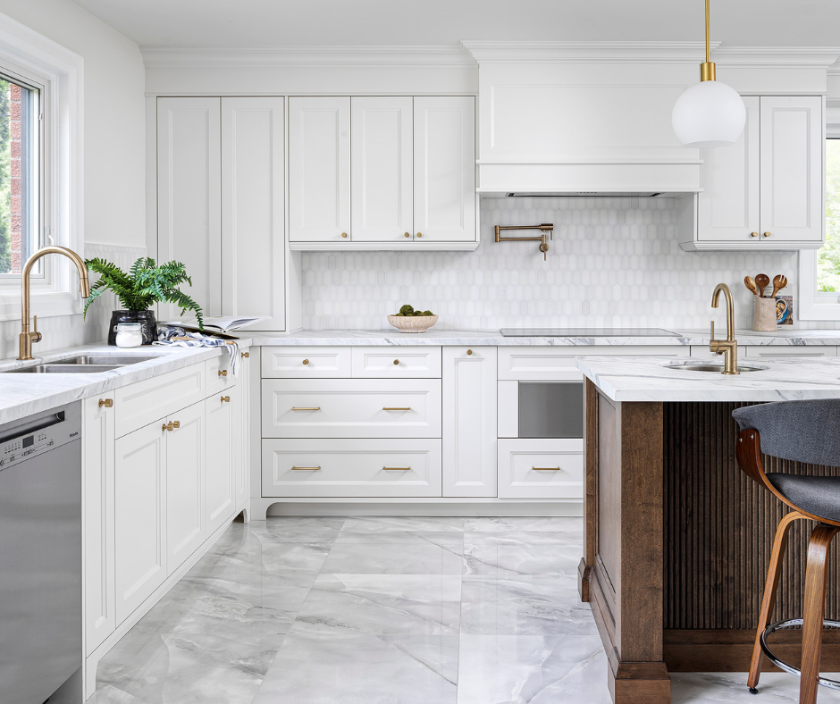 Custom Cabinetry, Marble-Inspired Surfaces & Brass Accents