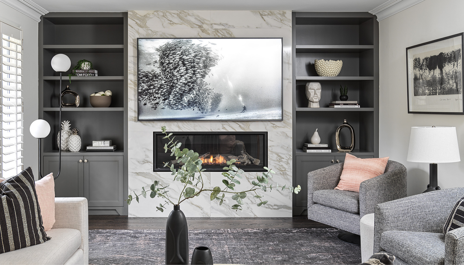 Coffered Ceilings, Custom Built-Ins & Marble Fireplace Surround