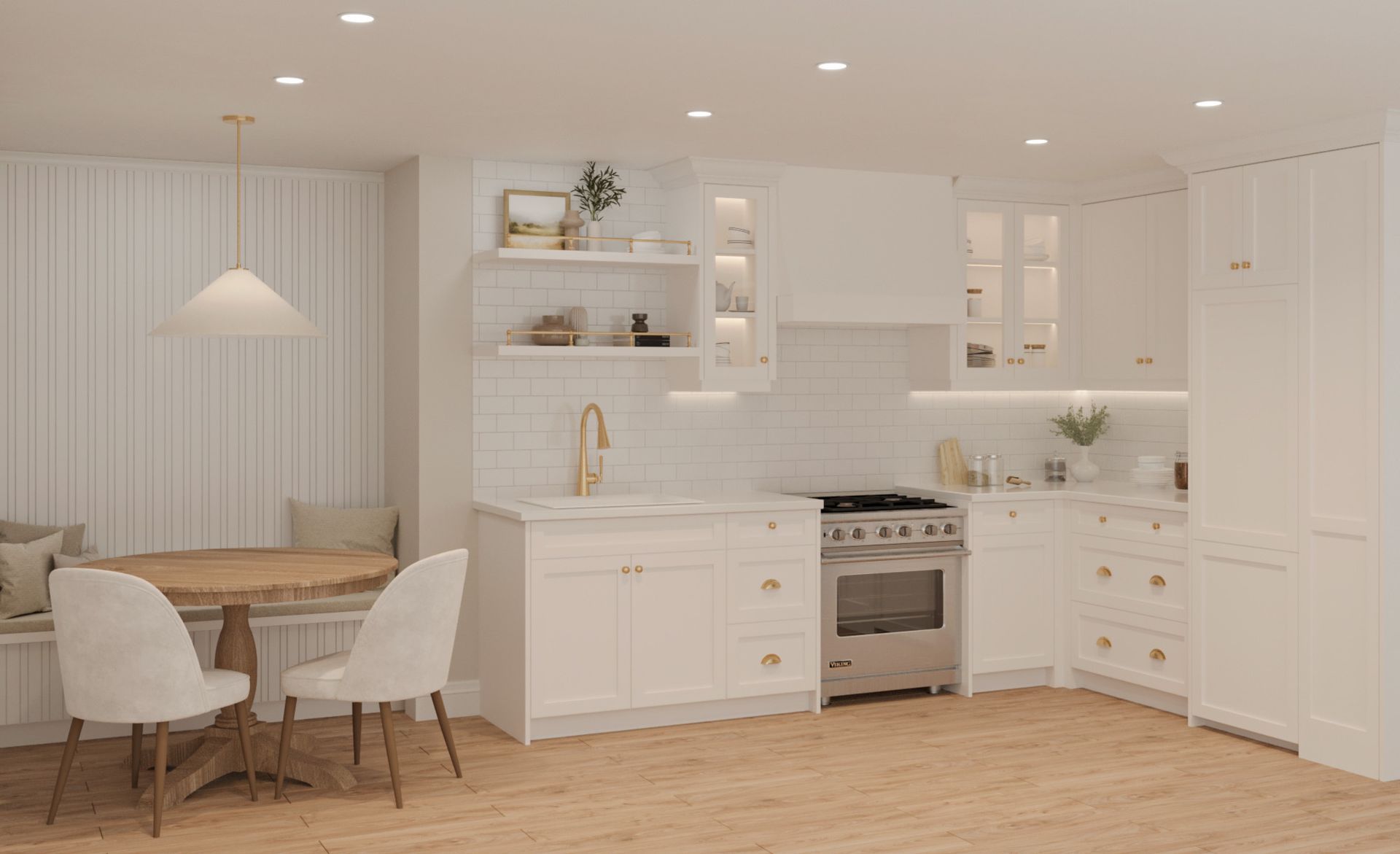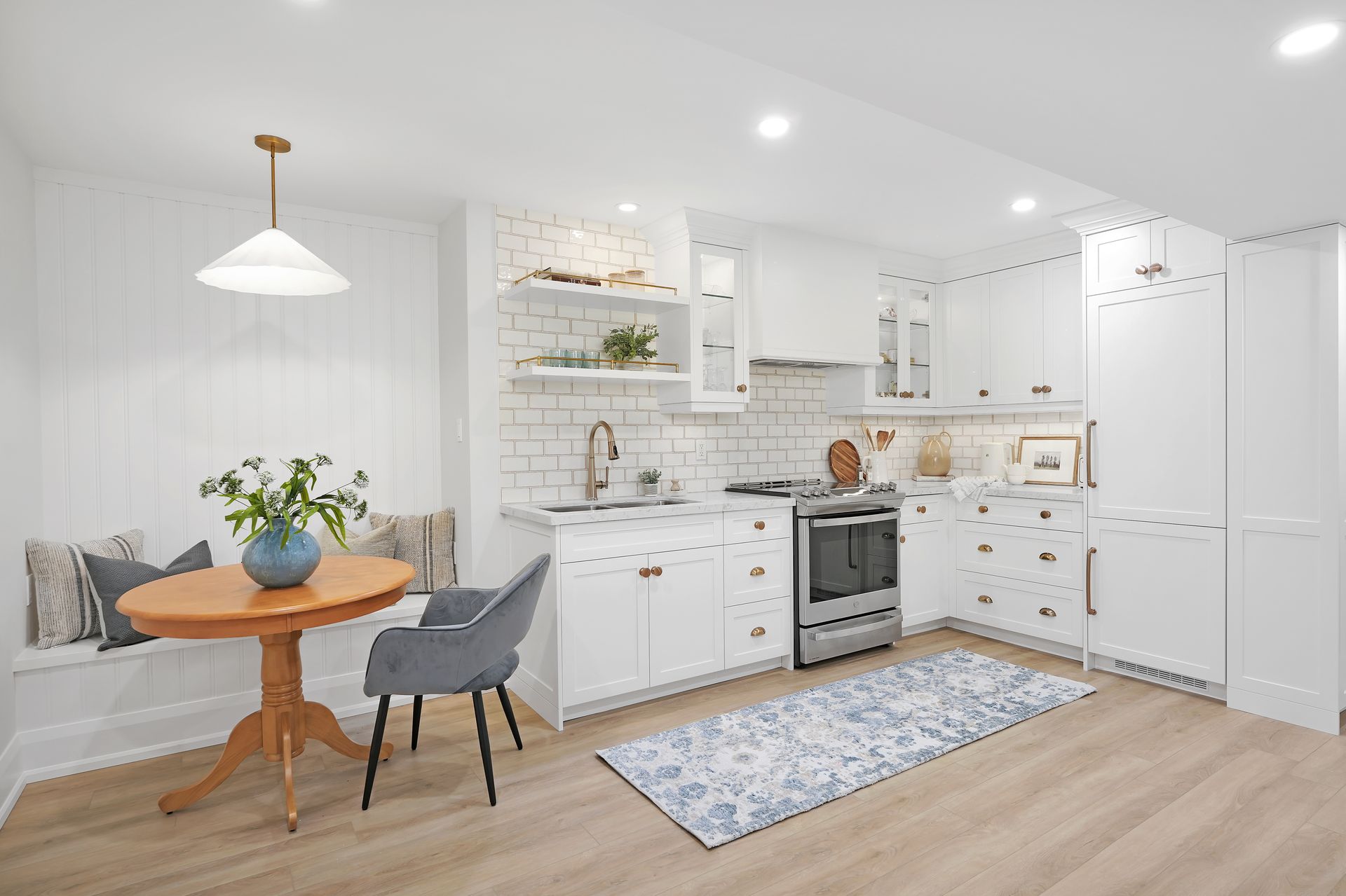For a young family of four, we transformed the basement into a warm and welcoming in-law suite for their children’s grandmother, relocating from out East. Thoughtfully designed with a kitchen, dining area, bedroom, and ensuite, the suite provides both comfort and independence.