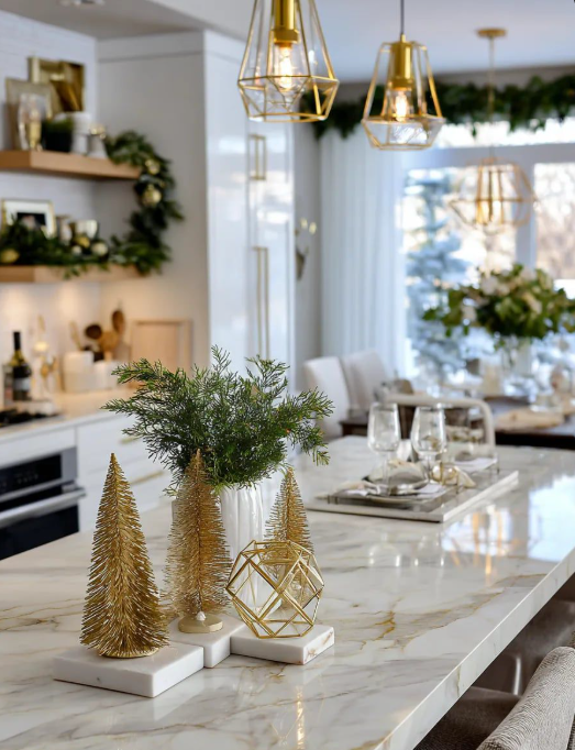 This year’s tabletop décor focuses on understated elegance and organic beauty. Create layered arrangements using fresh cedar or eucalyptus, paired with candles in varying heights for ambiance. Add texture with elements like pinecones, berries, or glass ornaments to tie into your tree’s colour palette. For a refined holiday dinner, consider a low, linear centerpiece that encourages conversation while keeping sightlines open. Don’t forget the smaller vignettes—side tables, consoles, and kitchen islands offer the perfect opportunity for subtle, festive touches that make every corner feel intentional and inviting.