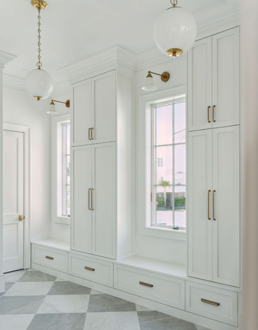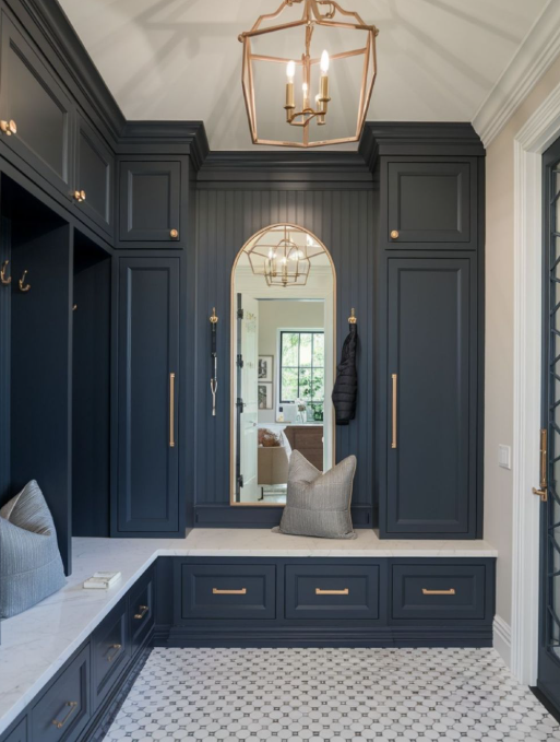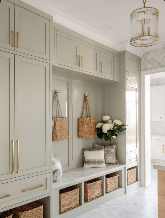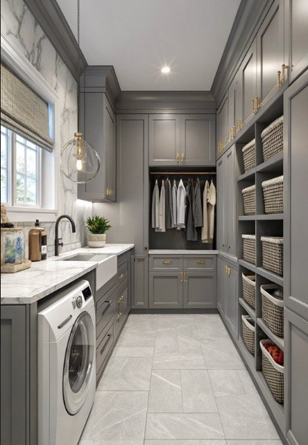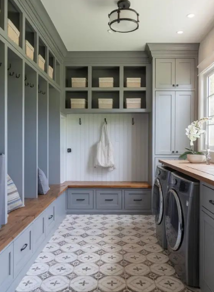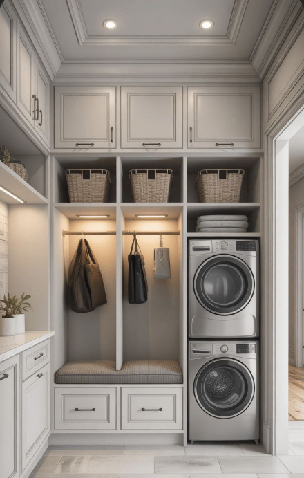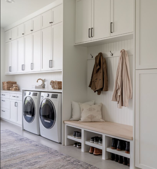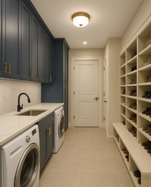 When space allows, combining the mudroom with the laundry room is a game-changer for busy households. This pairing keeps messes contained and makes everyday routines more efficient. Thoughtful millwork, folding counters, and integrated storage turn this dual-purpose space into a highly functional hub that supports real family life without feeling utilitarian.