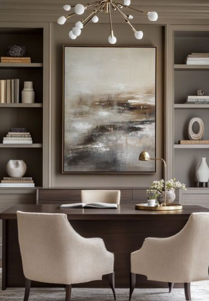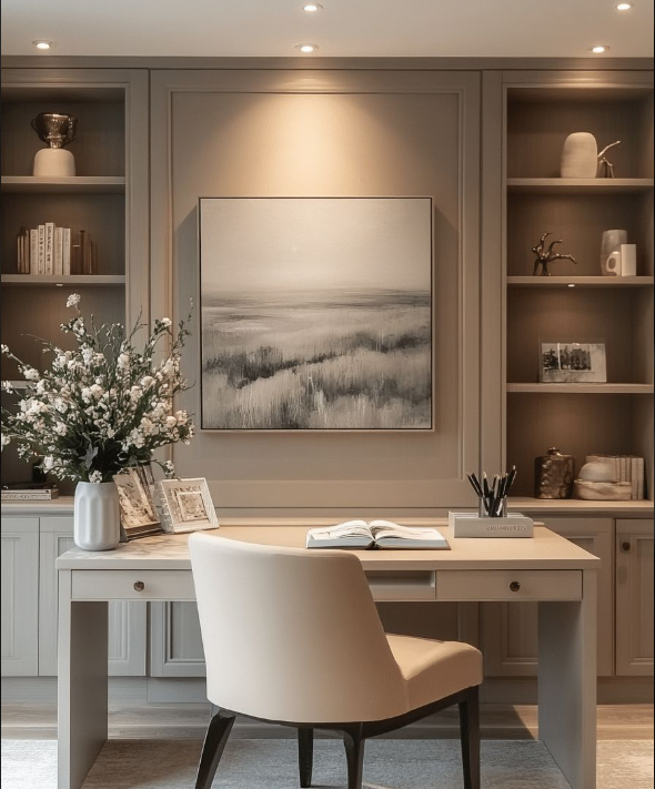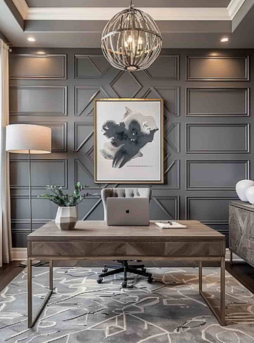When space or budget doesn’t allow for full built-ins, a limited-millwork home office can be the perfect balance of function and style. These spaces rely on a few key pieces—such as a well-made desk, a storage console, floating shelves, or a feature wall—to create a polished and organized work environment without overwhelming the room. With thoughtful styling, quality furnishings, and strategic lighting, even minimal millwork can make a big impact.