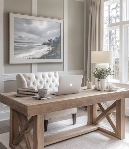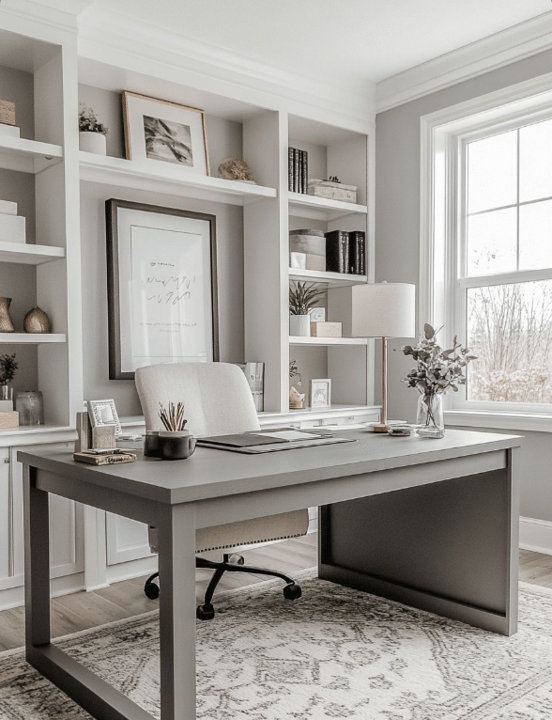 This approach keeps the design light and flexible while still offering a cohesive, professional workspace. It’s ideal for homeowners who want a beautiful, intentional office without committing to full custom cabinetry—proving that with the right elements, less truly can be more.