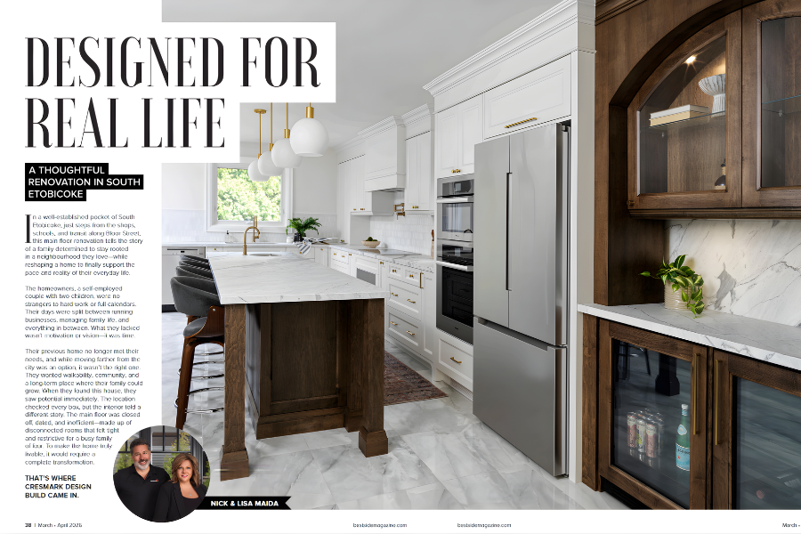 A thoughtful renovation in South Etobicoke where timeless design meets everyday function. This feature explores how a dated family home was transformed into a refined yet highly practical space — blending custom millwork, layered textures, and elegant finishes with smart planning tailored to modern family living. It’s a story of reimagining layout, maximizing storage, and creating a kitchen that feels both elevated and effortlessly livable — beautifully capturing our commitment to designing homes that work as beautifully as they look.